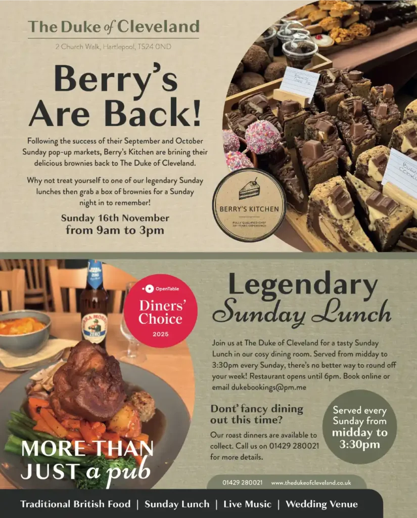 December at The Duke of Cleveland brings a brilliant line-up of live music alongside the final Berry’s Kitchen pop-up of the year. From festive treats to Friday-night performances, it’s the perfect way to enjoy the run-up to Christmas on the Hartlepool Headland.
